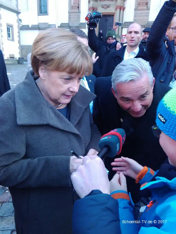 Die Zahl der Wartenden war insgesamt überschaubar, zieht man Presse, Polizei- und Sicherheitsleute ab, waren es zwischen 30-40 Menschen, die in der Kälte warteten. (In Hohenlohe wird halt samstags ums Haus rum was gschafft) Ein Junge nutzte seine Chance und ergatterte sich ein Autogramm, dann gings für Angela Merkel mit Entourage flugs weiter in die Klosterkirche.