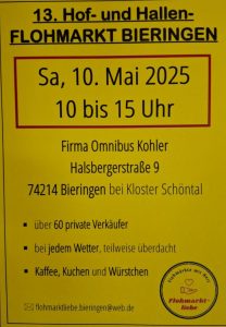 Hof- und Hallenflohmarkt am 10.05.25 in Bieringen Jochen Grübel / 28. April 2025 Es ist wieder soweit, die Flohmarksaison ist eröffnet in Bieringen. Der 13. Hof- und Hallen Flohmarkt findet am 10.05.2025 auf dem Gelände der Firma Omnibus Kohler von 10.00 – 15.00 Uhr statt. Hier ein paar Galeriebilder aus den vergangenen Jahren.